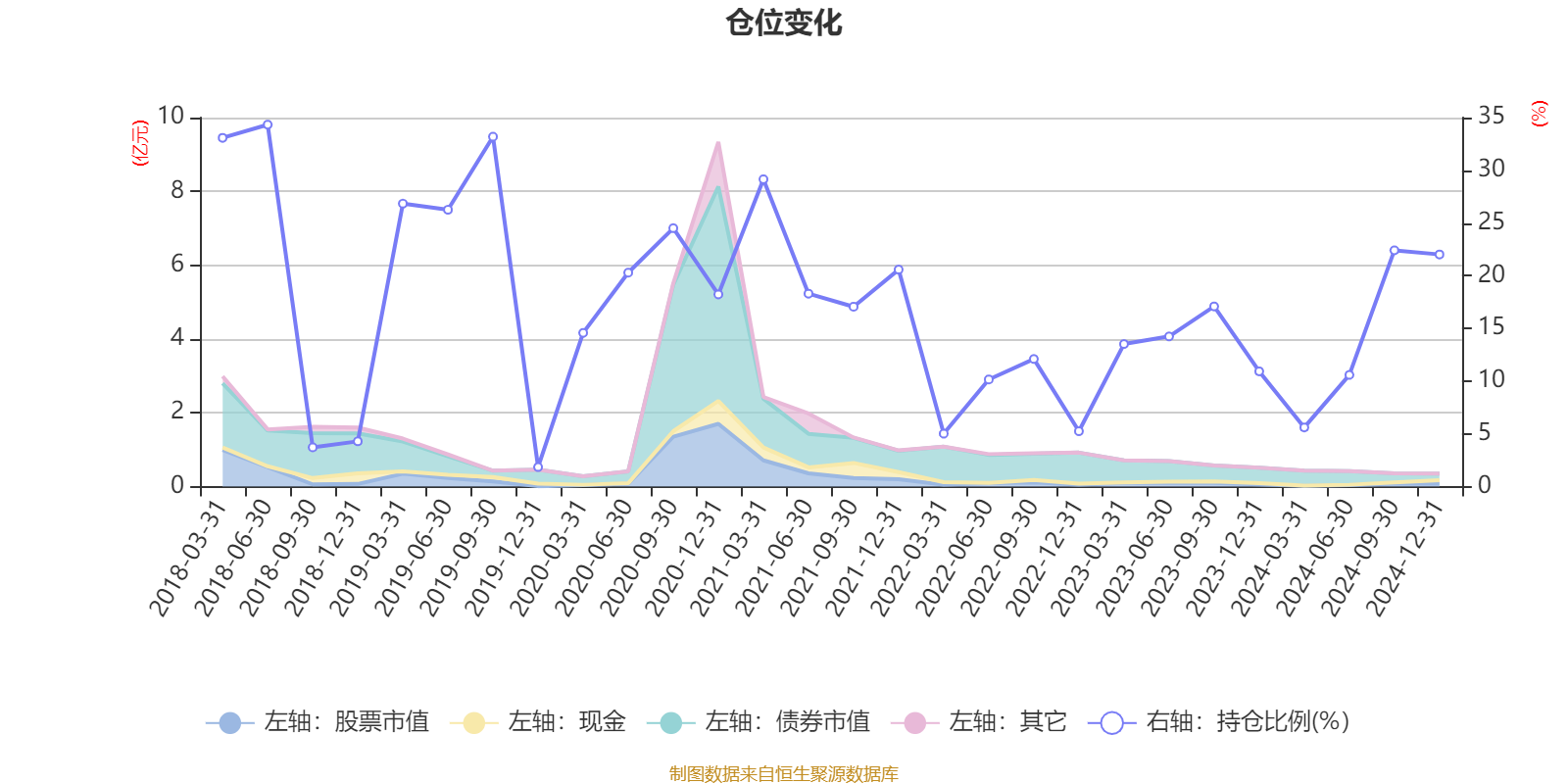 据定期报告数据统计,近三年平均股票仓位为12.41%,同类平均为18.74%。2018年上半年末基金达到34.33%的最高仓位,2019年末最低,为1.85%。